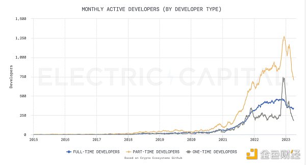 尽管数据显示 Solana 生态系统的全职开发者数量有所下降,但降幅不大,而一次性和兼职开发者较 2022 年底的水平大幅下降。 这种急剧下跌可以归因于 FTX 破产和熊市来解释。不仅许多基于 Solana 的项目的金库都在 FTX 交易所,而且 FTX 可以说是 Solana 项目最大的投资者。
