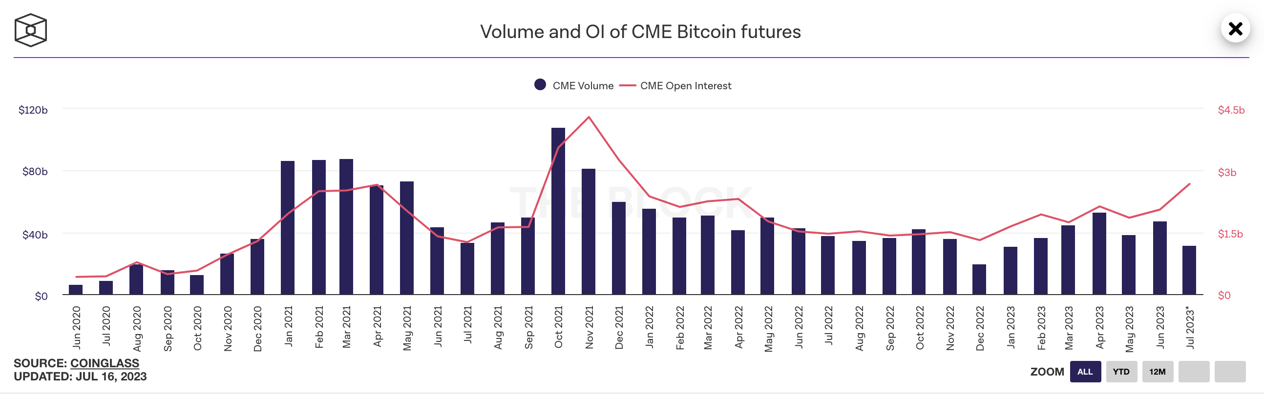 7月至今CME比特币期货未平仓合达26.8亿美元,创2022年1月以来新高