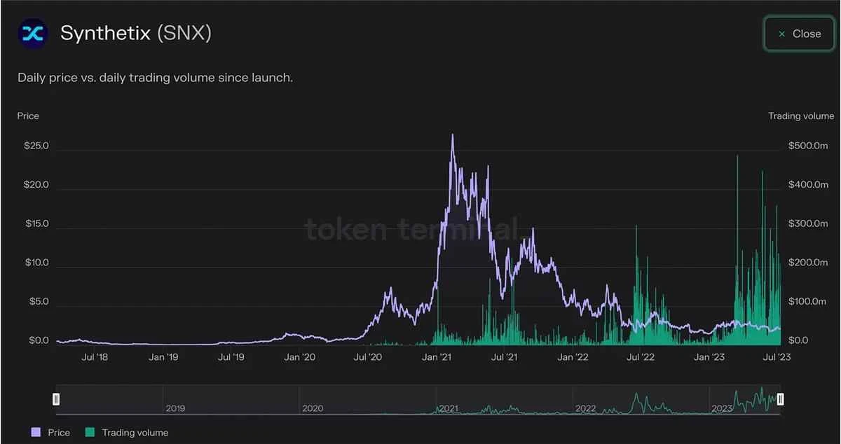 下面是来自 Token Terminal 的图表,显示了 SNX 的价格以及利用 Synthetix 流动性进行的交易量。如图所示,最近的链上活动与 SNX 的当前价格之间存在较大的分歧。