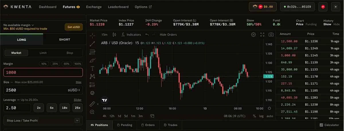 截至目前,Synthetix 的总锁定价值(TVL)为 3.75 亿美元,这意味着已经抵押了价值 3.75 亿美元的 SNX。一个建立在 Synthetix 之上并利用该协议流动性的示例是 Kwenta。Kwenta 是一个在 Optimism 上的永续期货交易协议,它没有原生流动性,而是从 Synthetix 继承流动性。Kwenta 上的所有交易对都是以 sUSD 计价,因此为了交易这些合成资产,用户需要通过质押 SNX(或在市场上购买 sUSD)来铸造 sUSD。