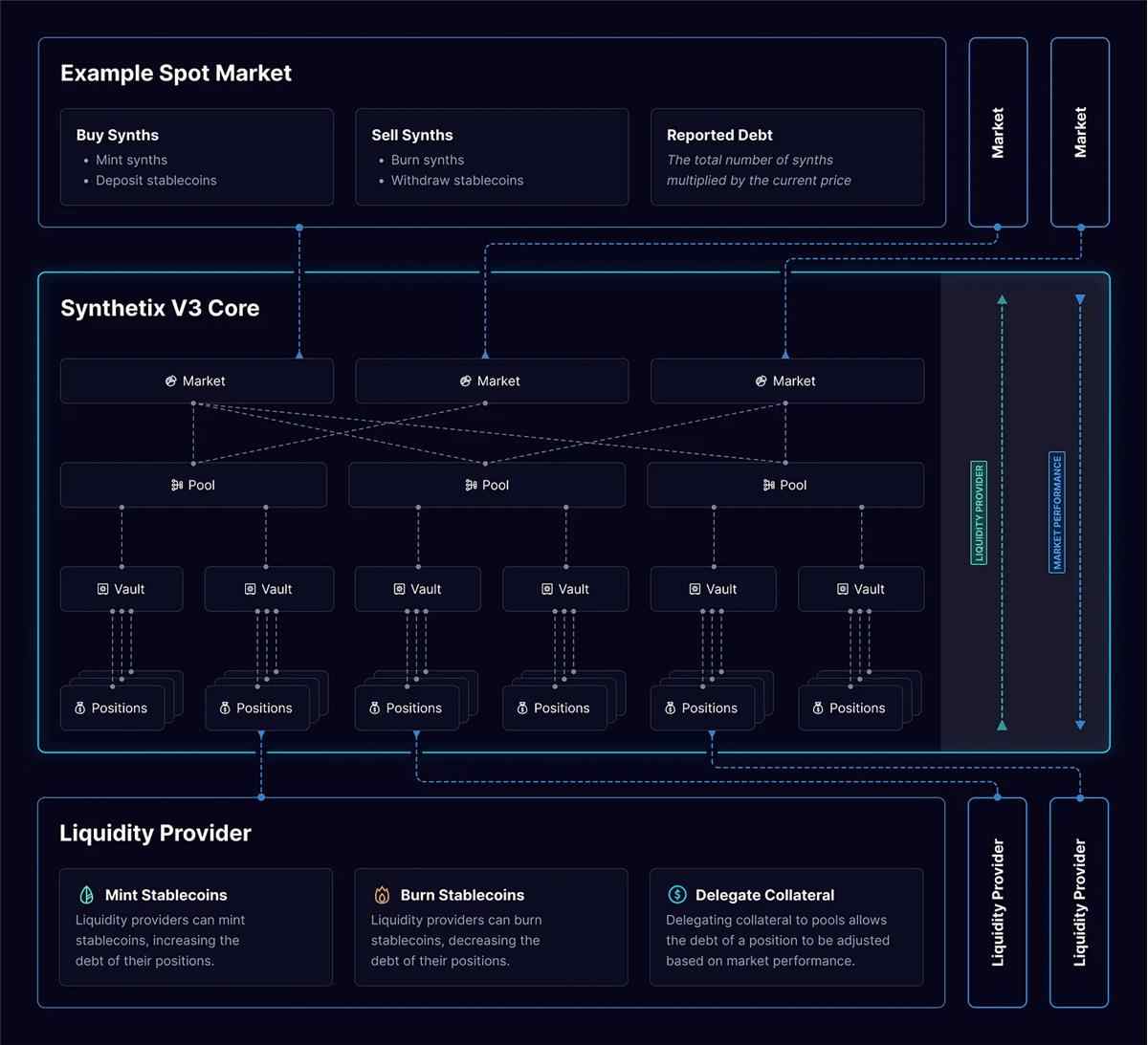 下面是 Synthetix V3 现货市场的结构概述:用户将其资产存入保险库,这些保险库被添加到特定的池中。这些池可以被协议使用,用于在 Synthetix 流动性池之上创建市场。这些市场是用户在构建在 Synthetix 上的 dapp(如 Kwenta)上进行交互的对象。