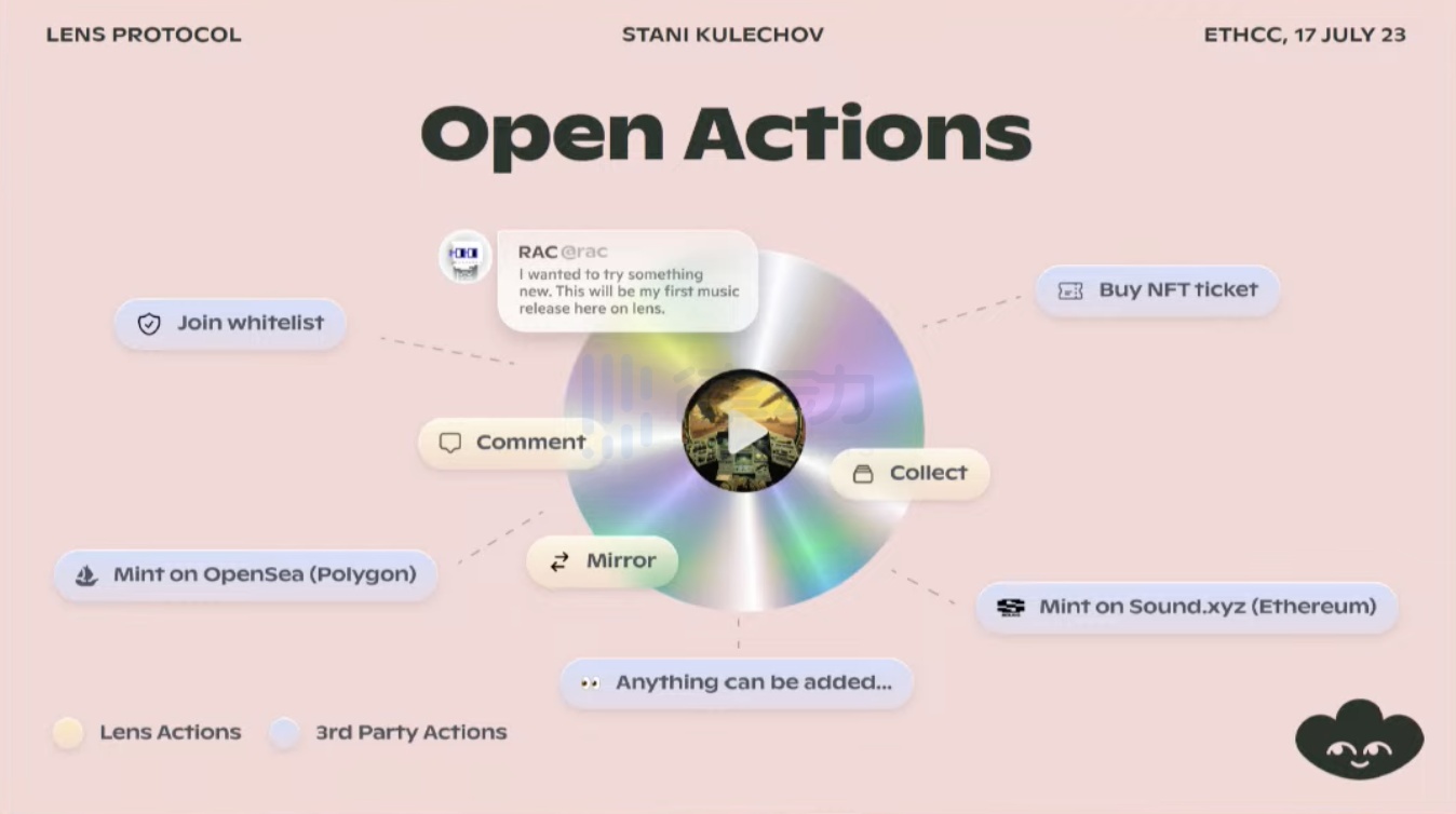 例如,通过 OpenSea 「铸币」开放行动,用户只需点击 Lens 帖子上的「铸币」,它就会直接在 Lens 上通过 OpenSea 合约铸造 NFT。应用程序可以与各种第三方市场和协议集成,以便在用户创建的帖子中作为开放操作执行。