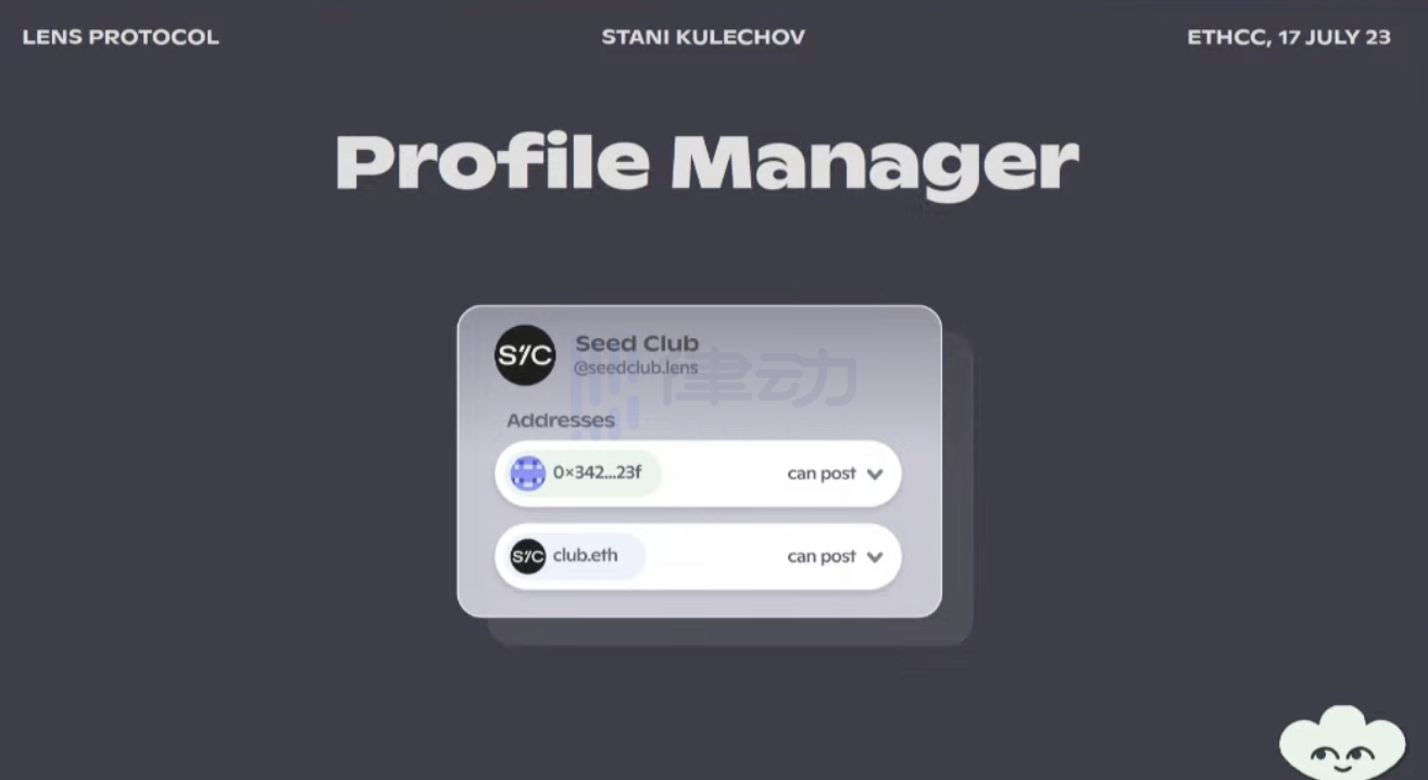 在 Lens V2 版本下,新的描述文件管理器功能允许 Lens 配置文件将社交操作委托给不同的钱包。描述文件管理器改进了 Lens 配置文件的安全层,允许用户将其配置文件直接存储在硬件钱包中,并将其与任何其他钱包一起使用。此功能还使 DAO 或社区配置文件存储在智能合约中,同时可以从一个或多个其他地址使用。社交操作可以委托给应用程序,以改善无气和无签名交易的用户体验。用户还可以设置一个遵循帐户抽象标准的地址作为描述文件管理器,解锁令人兴奋的配置文件管理新用例。