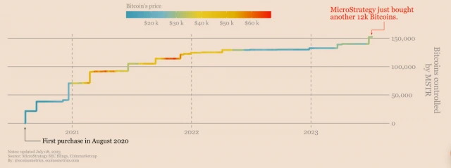 此后,该公司不断增加其比特币持有量,截至 2023 年 7 月,持有量已超过 15 万枚比特币,成为上市公司中最大的持有者。MicroStrategy 的股价(MSTR)与比特币价格波动密切相关。