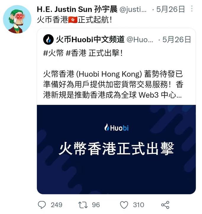 5月26日,孙宇晨在其Twitter上官宣,“火币香港正式起航”。至此,“大招”实锤。
