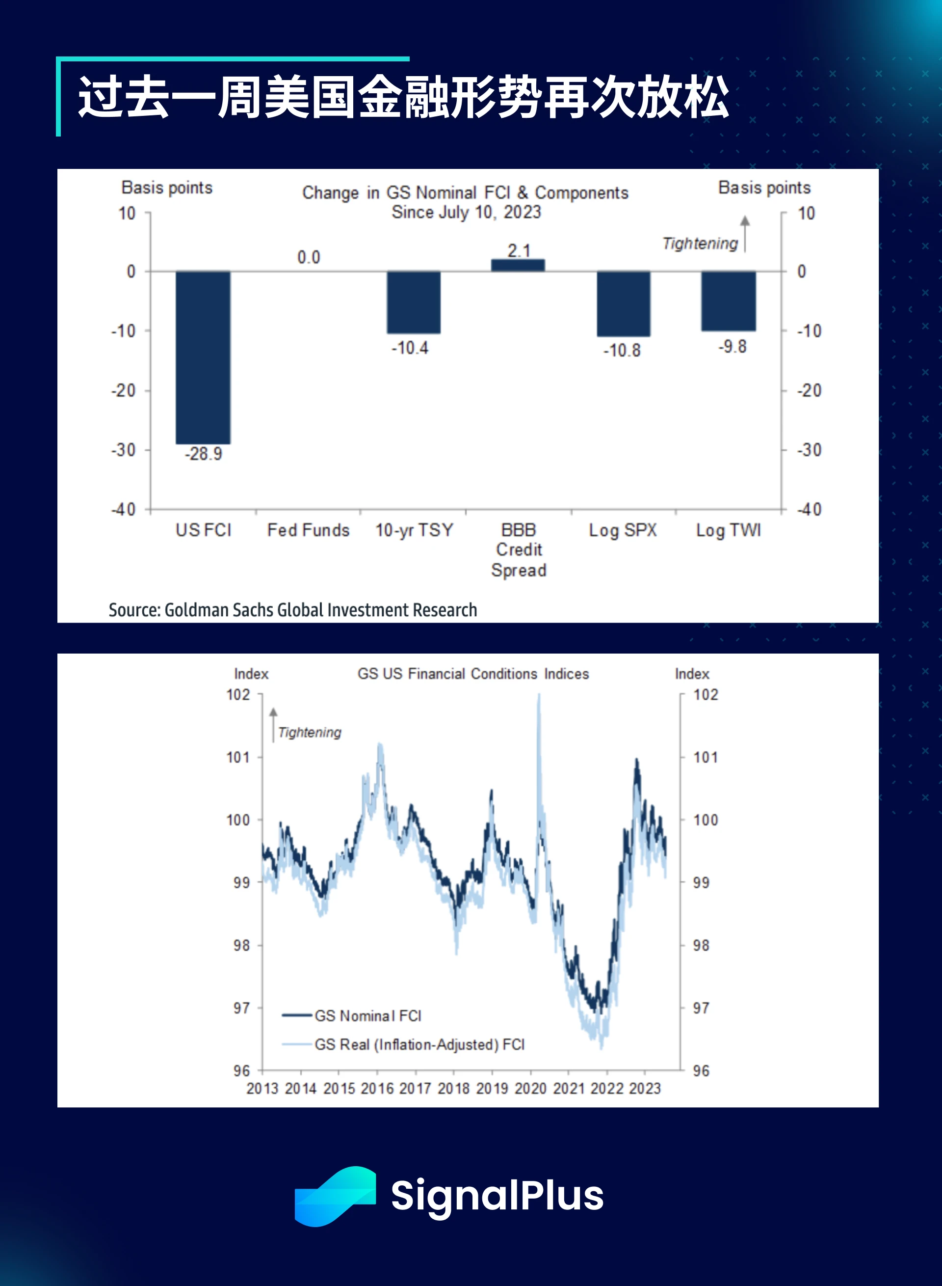 美国债券大幅上涨,加上美国股市和贸易加权美元持续呈现风险偏好的走势,美国金融形势在过去一周再次大幅放松;此外,美国经济数据表现显然超出预期,同时当前活动数据也明显改善,使得第二季度 GDP 预期也相应地上修。