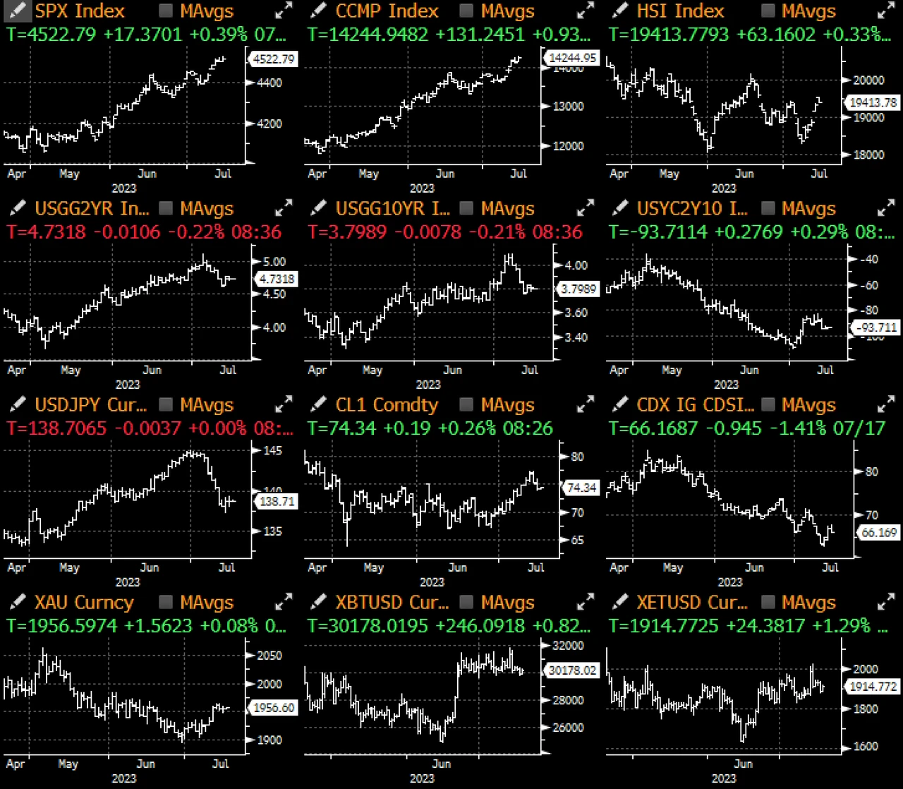 日本因假期休市,香港市场也因八号风球关闭,市场正逐步进入夏季低流动性的状态,纽约市场也同样平静,固定收益交易量仅为正常水平的一半,市场徘徊在上周五的水平附近,整体仍倾向偏好风险;中国再一次疲软的经济数据(第二季度 GDP 同比增长 6.3% vs 预期的 7.3% )在稍早时略微打击了欧洲市场的情绪,不过对后续美国市场的交易并没有什么负面影响。
