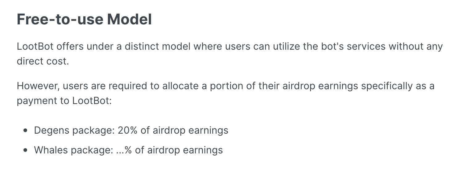 某些链上的费用可能会根据预期的空投价值而有所改变。此外还有一种免费使用 LootBot 模式,用户可以在没有任何成本的情况下利用 bot 的服务。但是,用户需要将他们空投收入的一部分专门作为支付给 LootBot。LOOT 持有量超过 10, 000 的用户还可以以 50% 的折扣享受订阅模式。LootBot 所收取费用的 75% 将返还给 token 持有者,所收取费用的 10% - 25% 将作为奖励分配给推荐人。