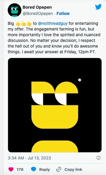 2023 年 7 月 11 日,Elon 以自己的另一个推特账户 Bored Opepen 向 ThreadGuy 提出了一个交易:用他初代版本的 Opepen(其他无数 Openen NFT 都是以此为基础衍生出来的)换取后者极具影响力的 MAYC。