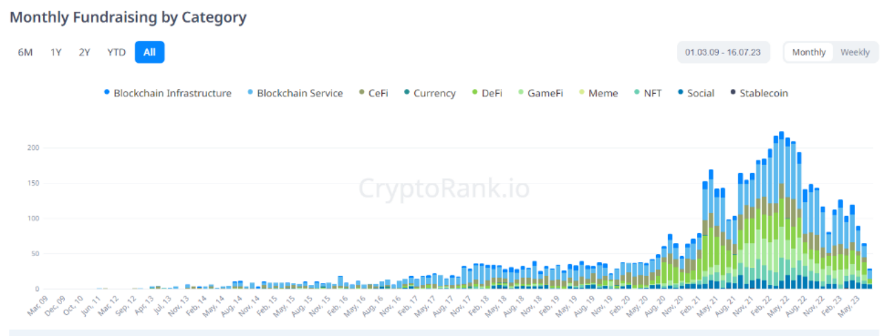 对于聪明钱在加密领域的更一般视角,CryptoRank 还提供了各种图表,突出显示重要的数据,如月度资金变动、最受欢迎的投资类别和最活跃的基金等。