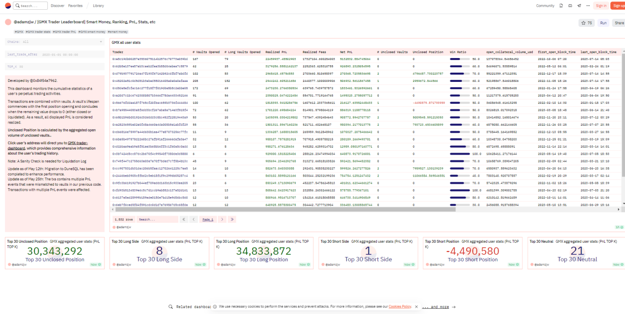 这个仪表盘是一个叫 adamzjw 的用户创建的,以按盈利或盈亏比率识别聪明钱交易者。然后,用户可以将他们的地址输入到 DeBank 或其他投资组合追踪工具中,进一步分析他们的链上行为。