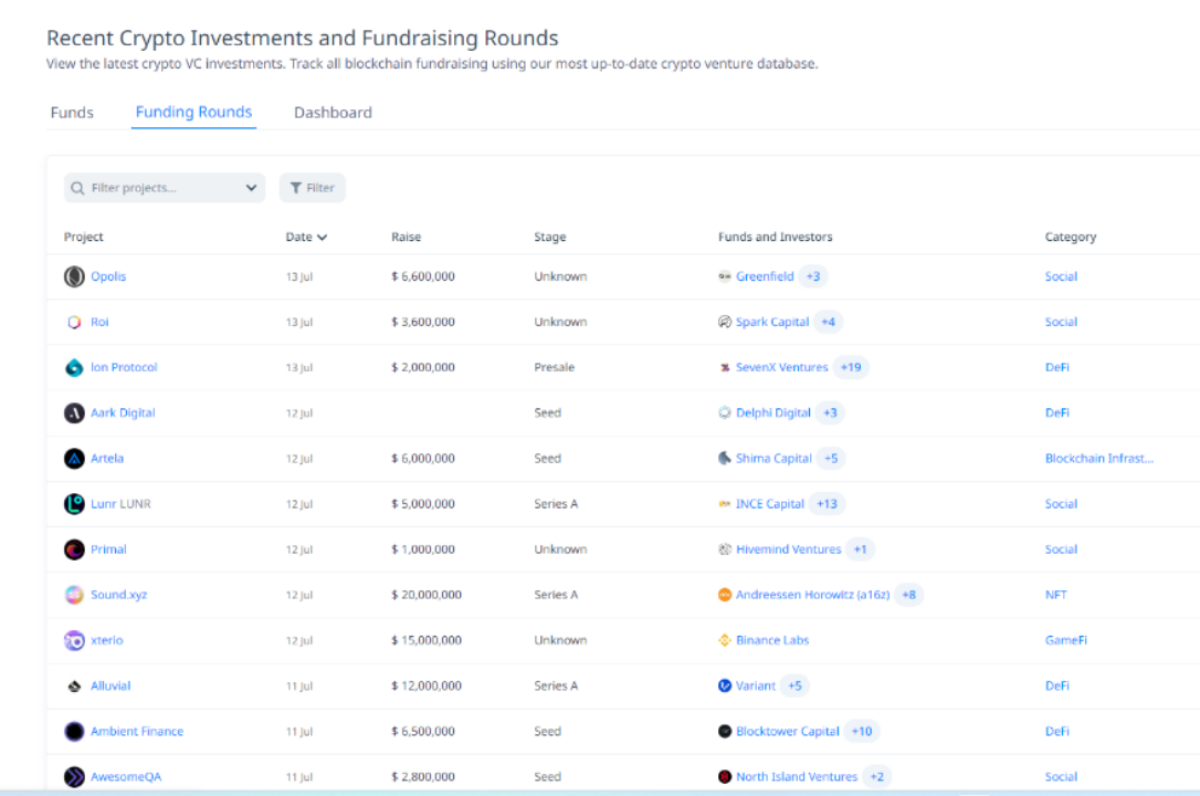 CryptoRank 可以用来检测近期的资金新趋势, 尽管该平台不像上述工具那样提供即时的链上分析,但 CryptoRank 提供了大量的数据,可以用来挖掘新的市场趋势和机会。该平台提供了各种工具和跟踪器,帮助用户深入了解市场,了解当前的资金投资情况。