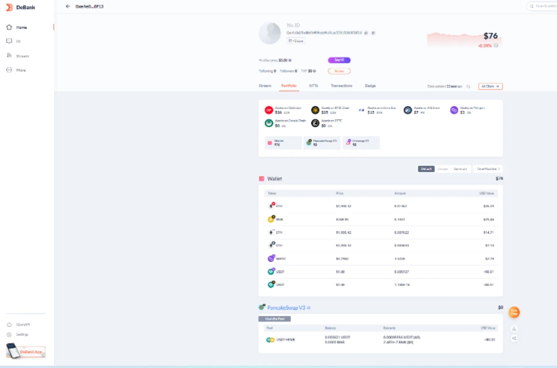 接着,用户可以将他们的钱包地址复制并粘贴到 DeBank 中,在那里您可以了解到他们当前的代币持有情况以及他们最近的交易。通过这些信息,用户可以获得他们的交易和投资策略的一些线索。