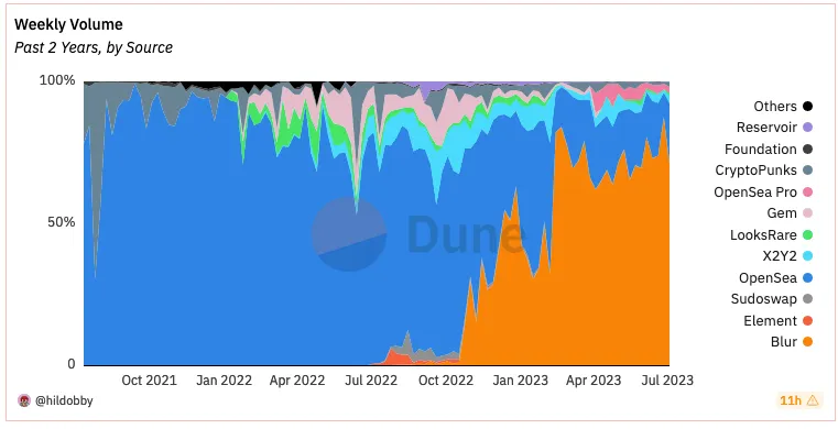 他的成功带来了竞争,首先是 LooksRare ,然后是 X2Y2 、Gem 和 Sudoswap,最后是 Blur 。