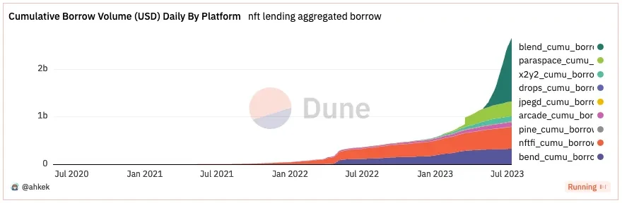 今年 4 月,NFT 借贷市场的累计交易额突破了 10 亿美元,而在 Blur 推出其 Blend 平台后,该市场最近在 6 月突破了 20 亿美元的门槛。
