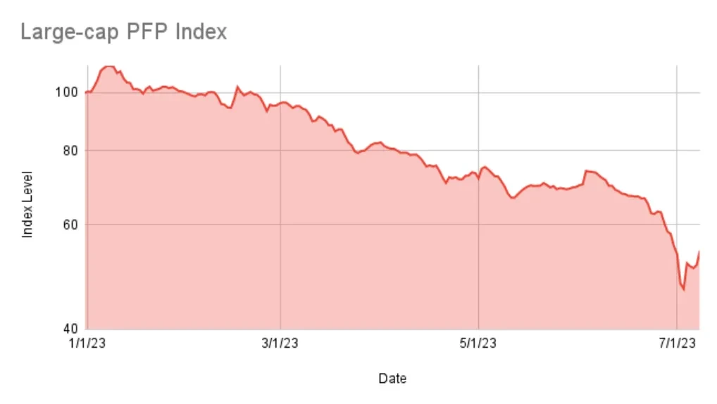 有趣的是,Art Block 指数在过去一年略微上涨,而 PFP 指数下跌超过 50% 。