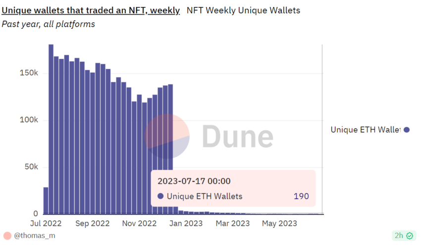 根据Dune的数据,在过去七天内,只有190个独立的ETH钱包购买或出售了NFT。相比之下,将近一年前,有超过181000个独立的ETH钱包做了同样的事情。