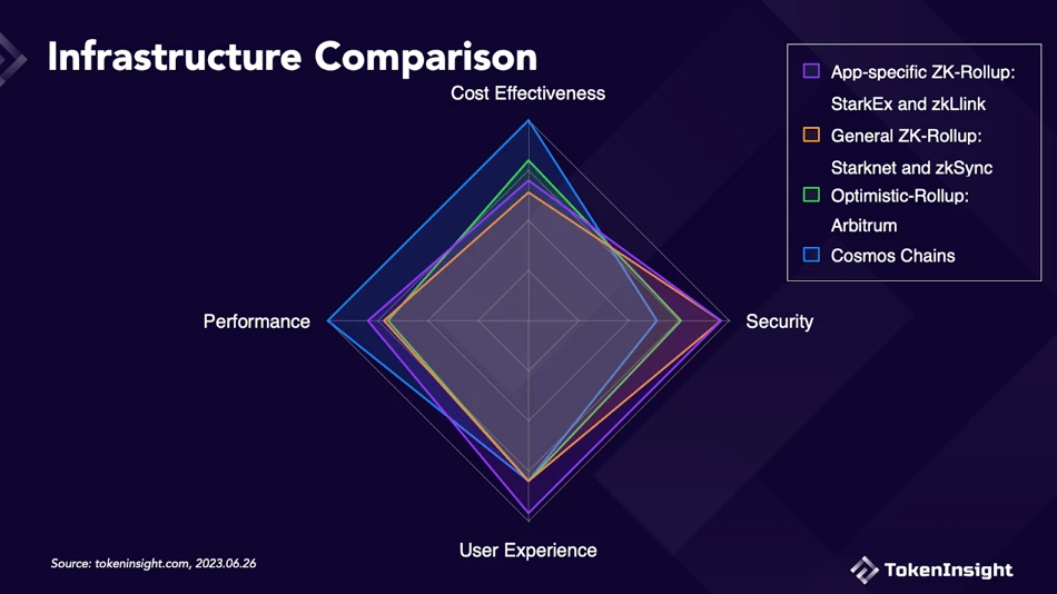 应用特定类型 ZK-Rollup 基础设施,StarkEx 和 zkLlink 在技术可用性方面具有明显的优势。且由于使用 ZK 技术,与 Cosmos 网络和 Optimistic 解决方案相比,它们在交易安全性上也具有一定优势。然而,特定于应用程序的基础设施可能在功能开发上会受到较大限制。对比来看,StarkEx 的应用目前都部署在以太坊上,基础安全性要更优。而 zkLlink 则支持原生多链,交易资产与流动性来源更为丰富。