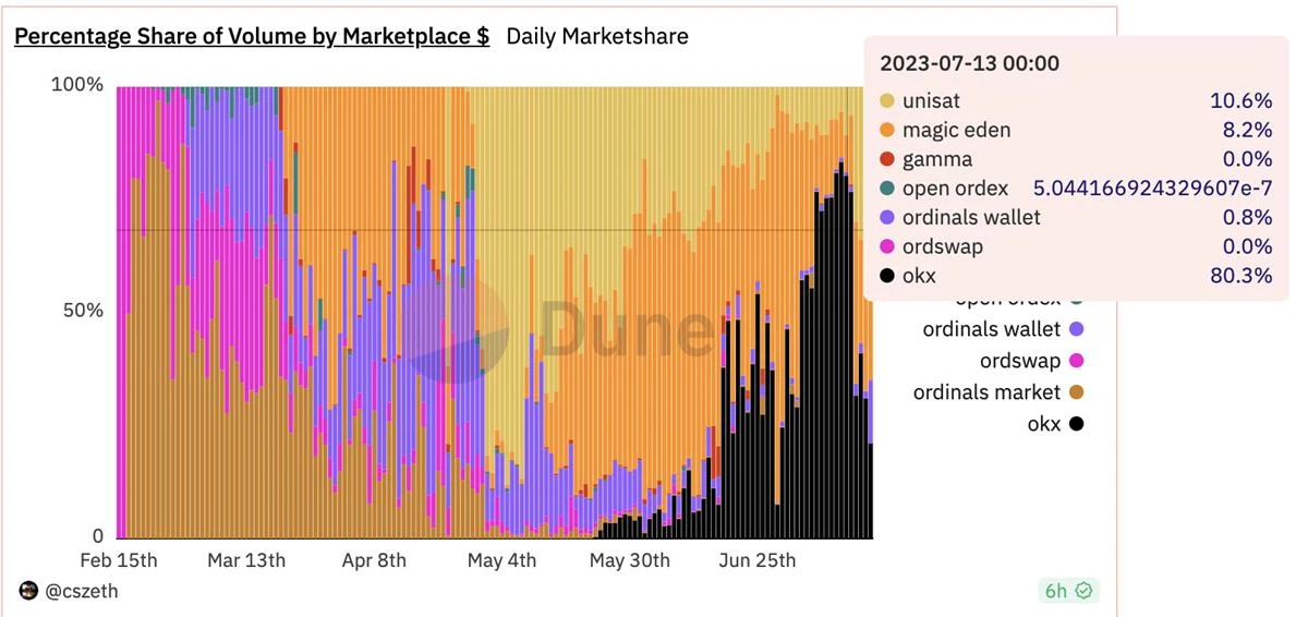 根据 Dune 数据面板,在 Ordinals 生态的交易平台中,OKX/Unisat/ Magic eden 长期占据前三的位置,其中,OKX Web3 Ordinals 市场已经成为交易量最大的 Marketplace,占据了超过 70% 的市场份额。由于其免除手续费的政策也吸引了部分刷量项目,但在进行屏蔽后仍占据 40% 左右的市场份额。