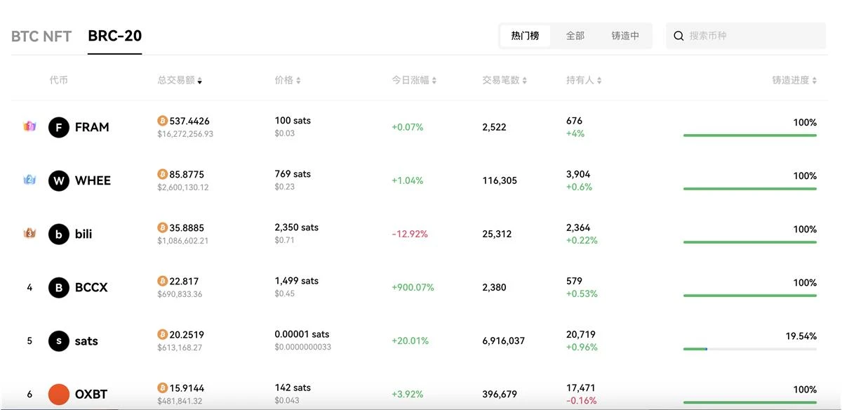 自 ORDI 始,各类 BRC-20 代币如雨后春笋,据 OKX Web3 钱包显示,截至 2023 年 7 月 18 日,目前平台上已上线 613 种 BRC-20 代币。