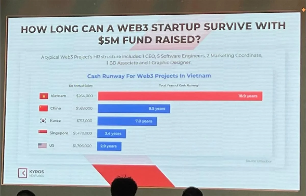 另一个引人注目的统计数据是:假设一家总部位于越南的 10 人 Web3 初创公司,拥有 500 万美元的资金,那么这样的配置可以供该公司存续运营 18 年的发展时间。相比之下,新加坡只有可怜的 3.4 年,美国只有 2.9 年。