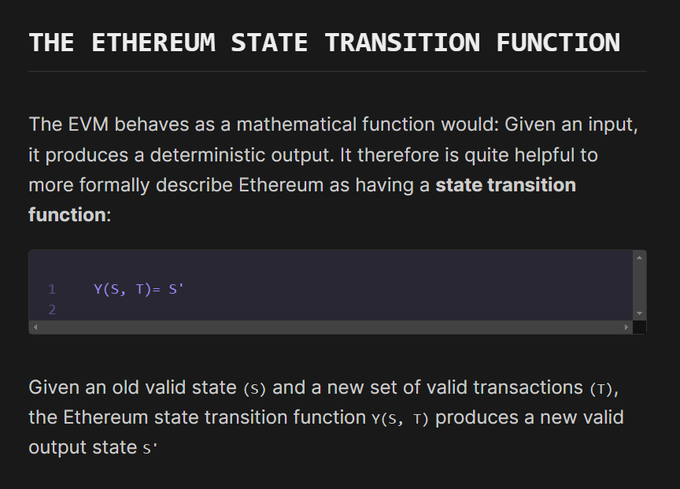 根据以太坊开发者文档,一个旧的有效状态(S)+ 一组新的有效交易(T),以太坊将产生一个新的有效输出状态 S'