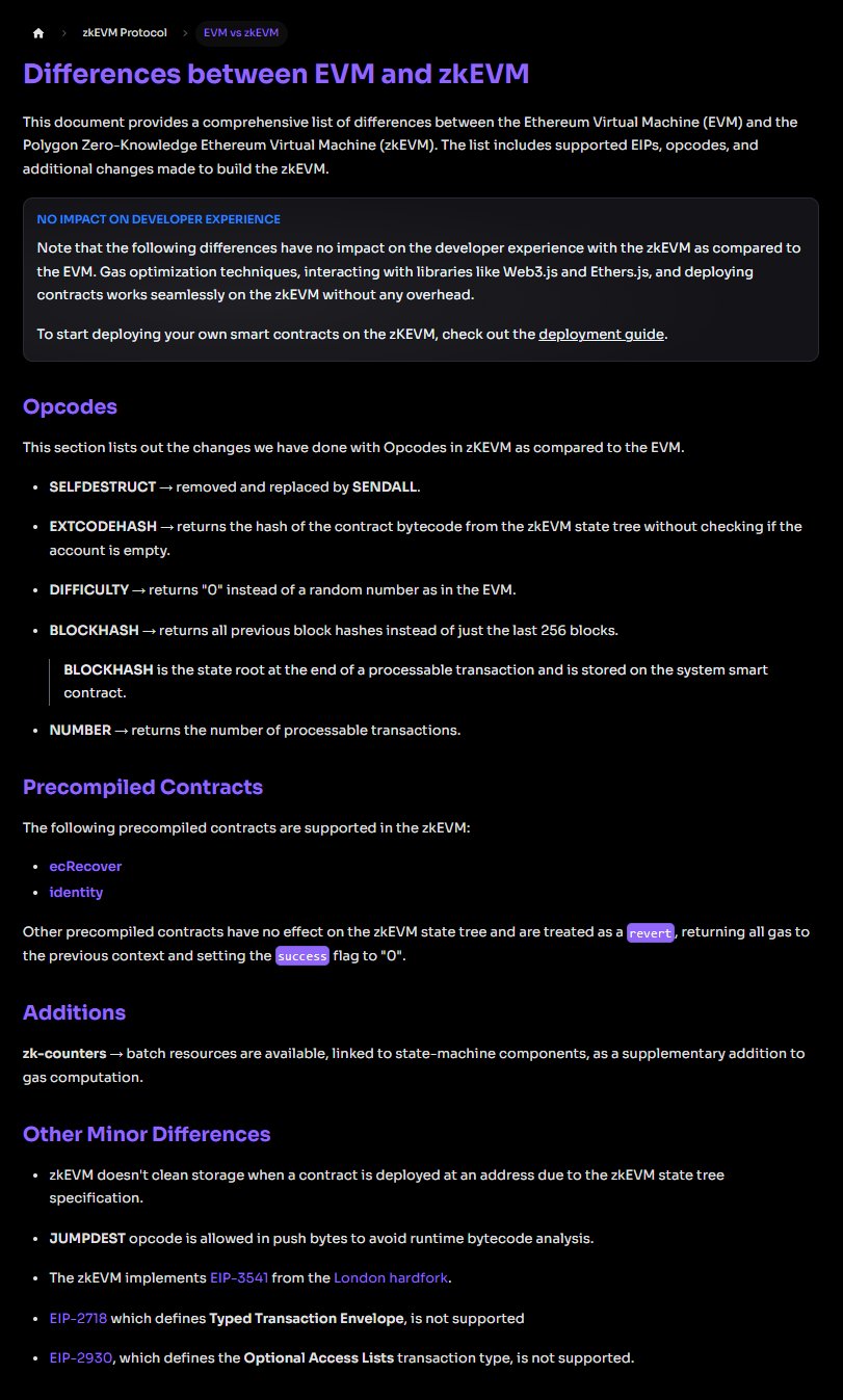 Polygon zkEVM 在官方文档列出了 EVM 和 zkEVM 之间当前的所有差异。