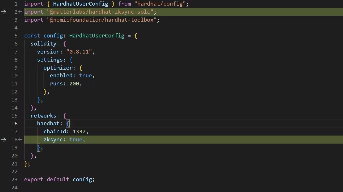 比如,在下例中,必须使用自定义 zkSync 扩展安装和配置 Hardhat 环境,以生成可以部署到 Era ZK-EVM 的字节码。