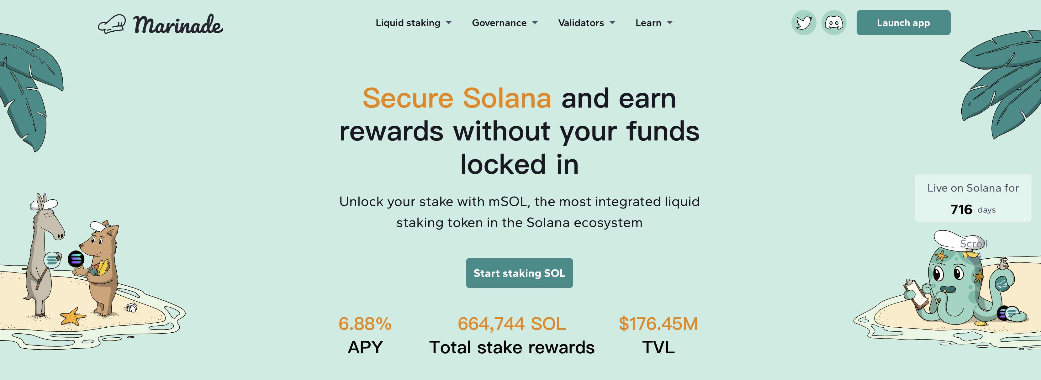 Marinade Finance 是目前 Solana 生态中 TVL 最高的项目。作为基于 Solana 链的流动性质押平台。它的主要目标是简化 Solana 的质押过程。Marinade Finance 的主要特点是它提供了「流动性质押」机制,用户可以随时将他们的质押资产转换为流动性,而不需要等待解锁期。这大大增加了用户的灵活性,并可能吸引更多的用户参与质押。