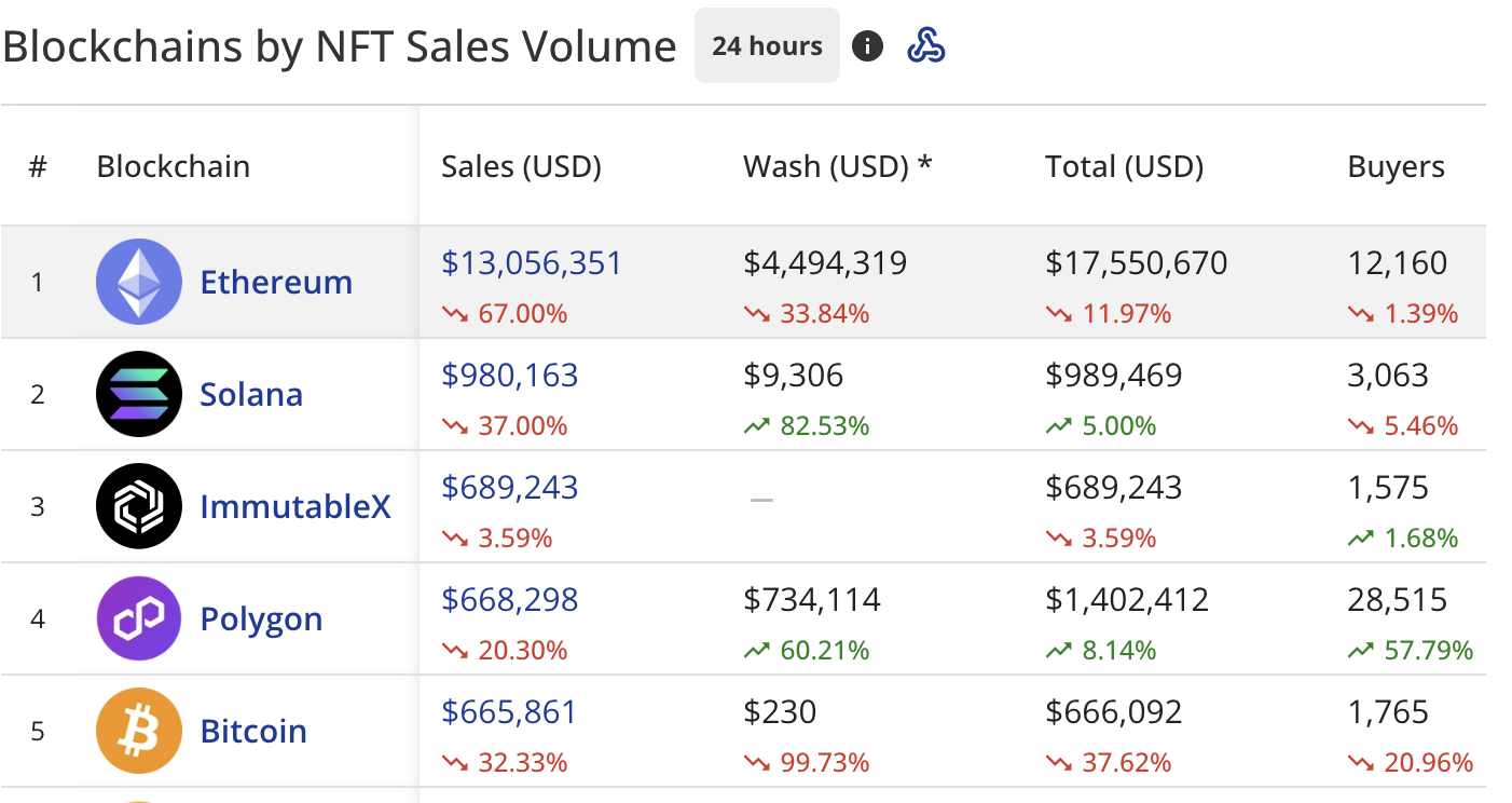 截止发文,Solana NFT 24 小时交易量仅次于以太坊。