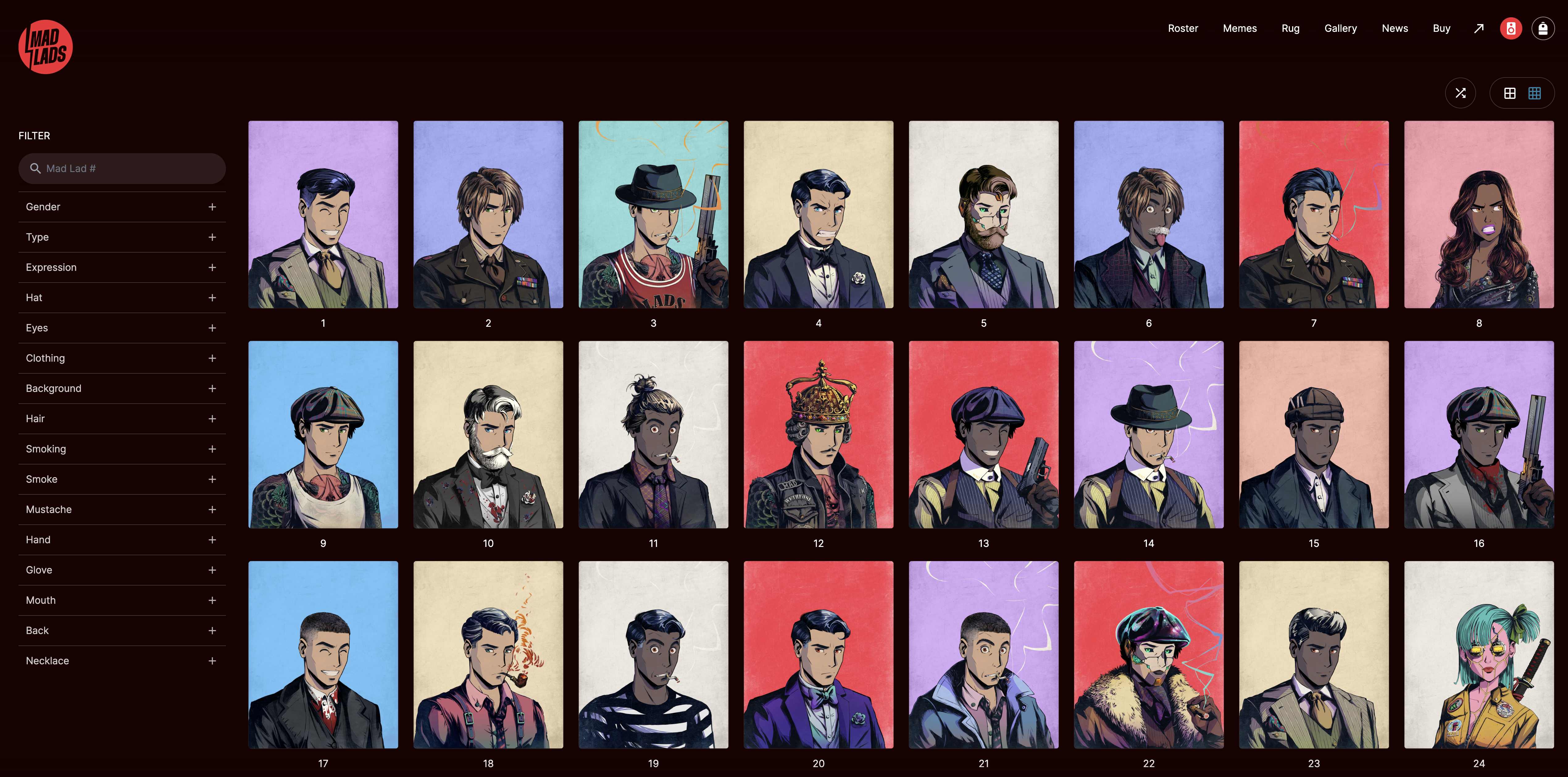 除了新的 NFT 平台,再来看看近期 Solana 上成交量最大,市值最高的 NFT 项目——Mad Lads。这是今年 4 月份由 Solana 钱包 Backpack 发布的 NFT 项目。凭借着精美的美式漫画风格和 Backpack 团队在 Solana 生态的良好积累,Mad Lads 现在已经广泛的被 Solana 生态接纳,曾经获得 Solana 黑客松第一名的 Zeta Markets 还与 Mad Lads 合作,举办了名为 Mad Wars 的社交交易竞赛。
