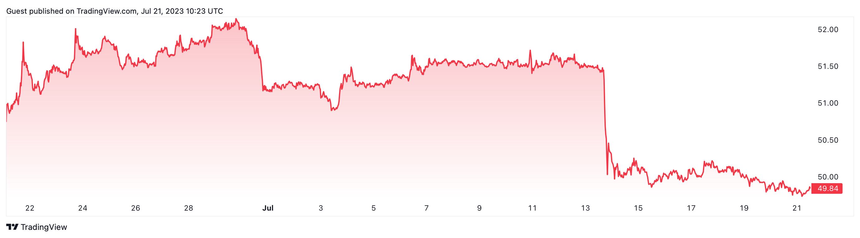 根据TradingView的数据,比特币目前市占率为49.83%,低于6月29日52%的高点,并在7月12日Ripple裁决后立即大幅下跌。