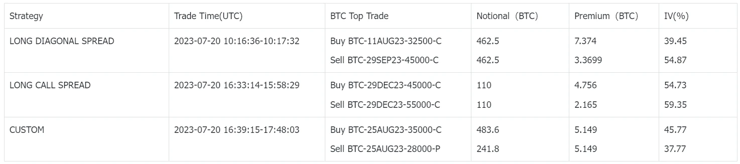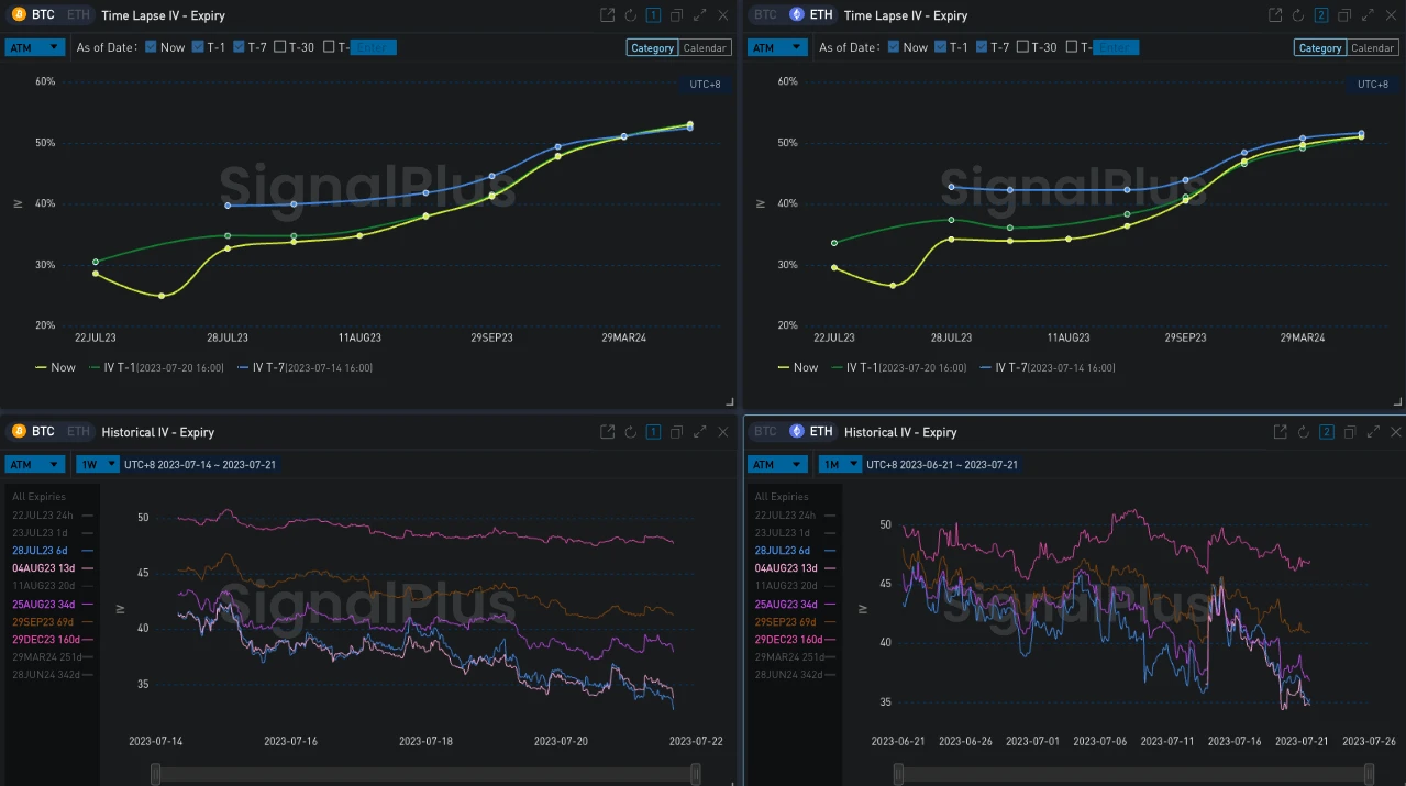 八月份今日出现一些看涨策略交易,包括 ETH 上卖出 5000 张的 25 AUG 23 1600/1900 Put Spread,还有 BTC 上买入的 35000/28000 Ratio Call Spread 以及买入 11 AUG 23-32500-C 卖出 29 SEP 23-45000-C 的日历价差。这也许是趁当前中前端 IV 还处于较低位置时,为即将(预计)于 8.3 号进行的 LTC Halving 提前建仓。