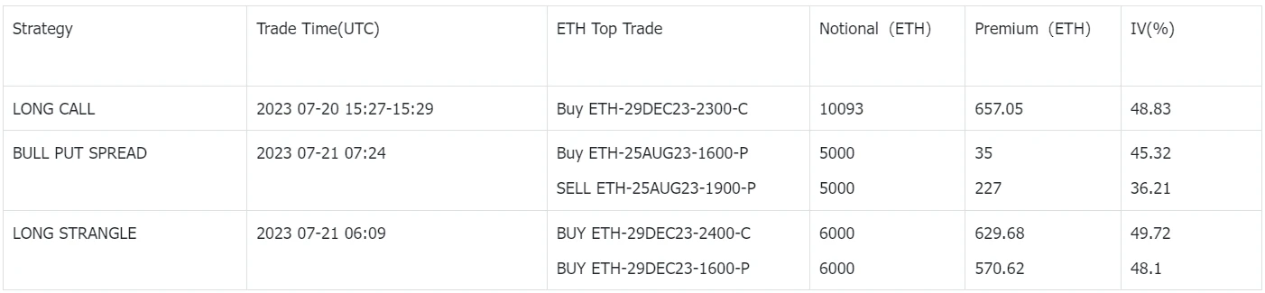 先从远期说起,ETH 最大的单腿交易为买入 10093 张 ETH-29 DEC 23-2300-C 的平仓单,在 Vol 上做到了止盈。另还有大量的 1600/2400 Long Strangle 持续在低位囤积远期波动率,一定程度上抬高了今日 ETH dec 波动率(47.08% ,+ 0.46% )。BTC 也仍持续可见 Call Spread 买入。