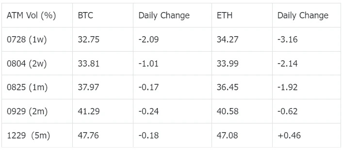 数字货币方面,BTC 在昨晚 UTC+ 8 22 点时出现了一波下跌(-1.5% ),随后持续在 3 W 下方横盘。主要币种的中短期隐含波动率继续下降, 23 JU L 2 3 更是因其良好的 Theta Hedge 性质而落入曲线低点(周末通常流动性较低,能够帮助 Hedge 重要月末期权的 Theta),Deribit 上该期限的大部分交易以 Sell Wing 上的期权为主。