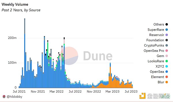上图是Dune面板中过去两年主要NFT交易平台的周交易量示意。可以看出,从去年年底到现在, Opensea从昔日霸主到如今被Blur蚕食,催促着Opensea推陈出新,重夺市场占有率。