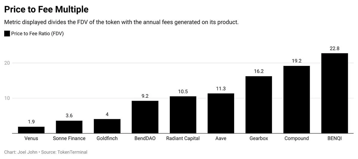 对于许多 DeFi 项目来说,这意味着能够更改费用变量、支持的资产和涉及财务的其他随机功能。在这种情况下,代币持有者从产品中不会获得收入,但他们持有的代币“管理”着可能获得收入的金库。因此,如果一个产品为用户创造了一亿美元的费用,那么在考虑公平估值时,基于这一数字的倍数是相关的。Compound 和 Aave 的市盈率与我们在上市的金融科技公司中看到的情况相一致。市场在短期内受到叙事的驱动,但随着时间的推移会回归理性。