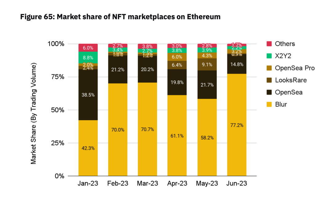 与2022年下半年相比,#NFT(非同质化代币)在2023年上半年的交易量有所增加,这主要是由于2023年初在 $Blur 市场上活动的增加。