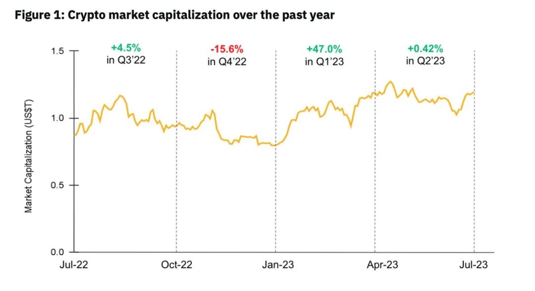 截至2023年6月30日,Crypto行业总市值较2022年同期增长了30.3%,达到1.17万亿美元,而一年前为0.9万亿美元。