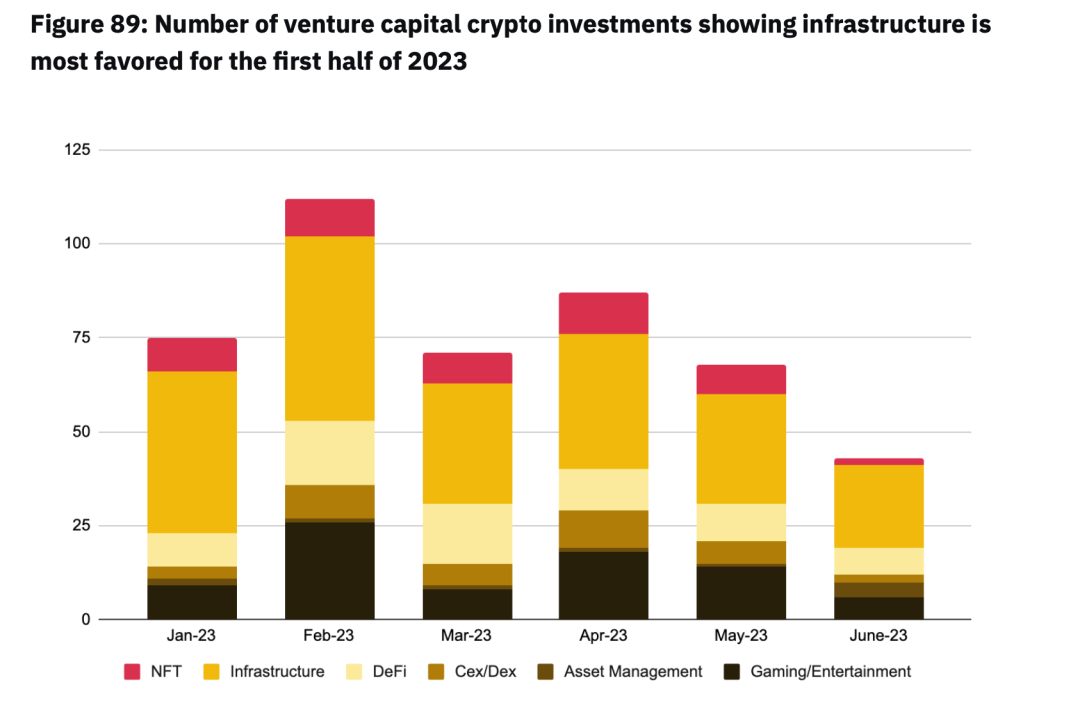 #VC 风险投资领域,基础设施 #infrastructure 领域吸引了最多的投资,其次是 #游戏、#娱乐 和 #DeFi(去中心化金融)领域。