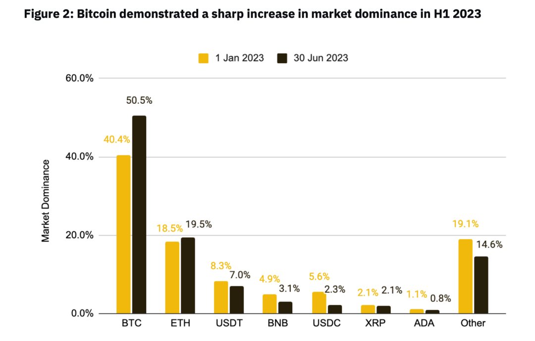 比特币 $BTC 在Crypto行业的市场份额在2023年上半年结束时达到了自2021年4月以来的最高水平。