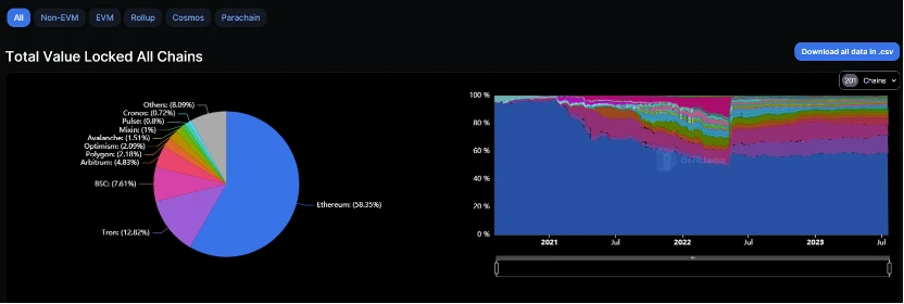 本周 ETH 链占比小幅下降,同时 Optimism 链出现 11% 的增长。