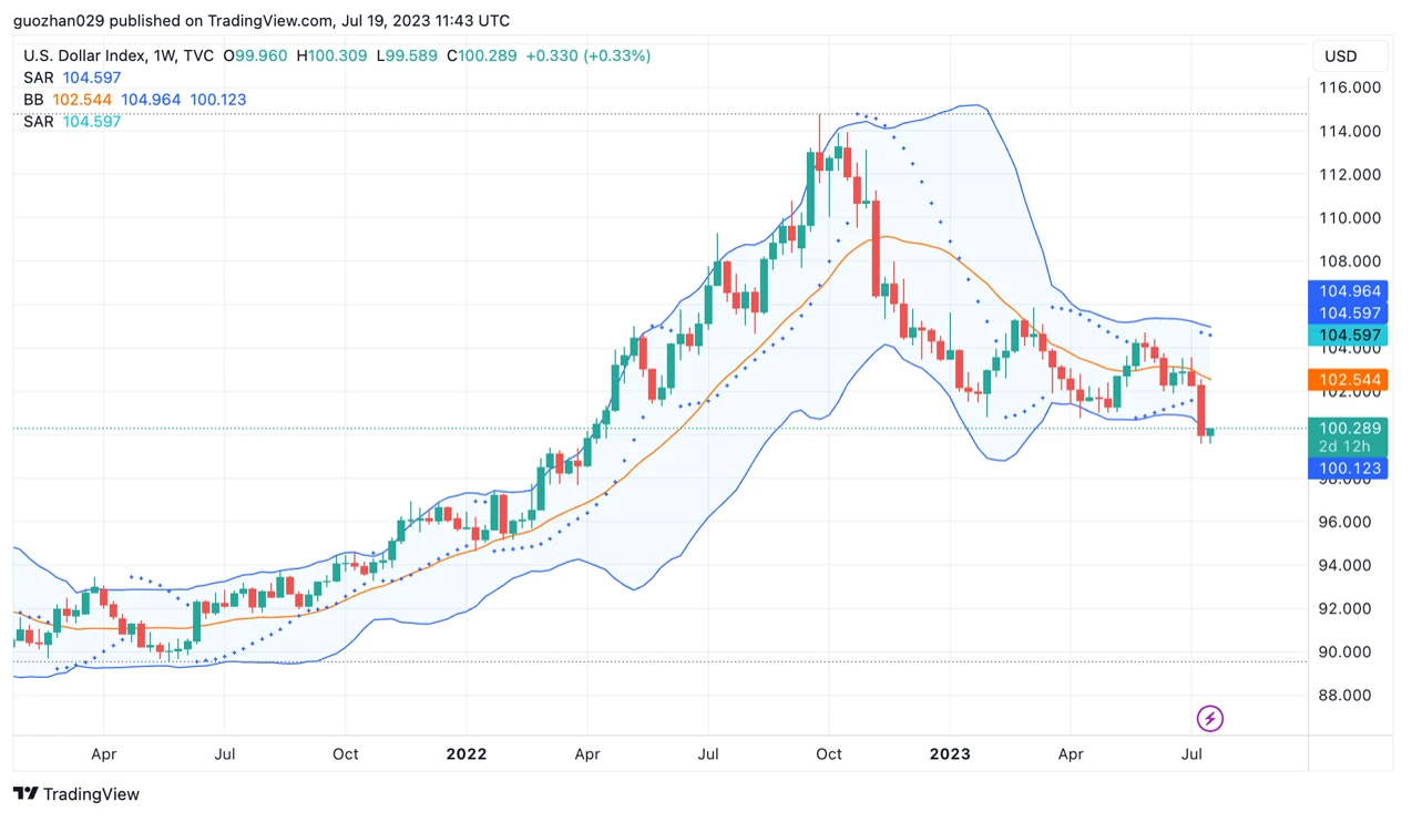 货币流动性趋紧。美国经济韧性持续显现,市场预期下周的美联储 7 月加息板上钉钉且为最后一次。美股继续强势创出 15 个月新高。美元指数持续下行,快速跌破 100 关口,利好资本市场。加密市场表现弱于美股,持续横盘调整。
