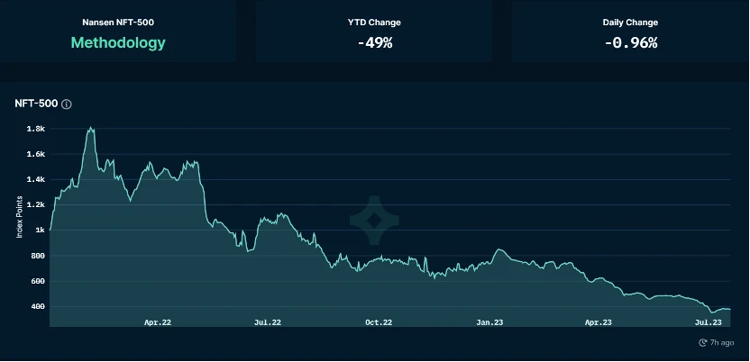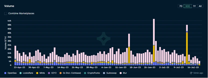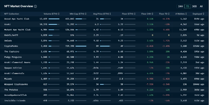 NFT 市场总市值依旧在稳定下降,从交易量情况来看,对比上周头部蓝筹项目交易量均出现了 20% 到 30% 的下降,进入 7 月份以来,整体交易量也下降了约 50% ,值得注意的是本周排在第四位的菠菜项目 Metawin,出现了连续的交易额增长,本周交易量超过 1000 万美元。
