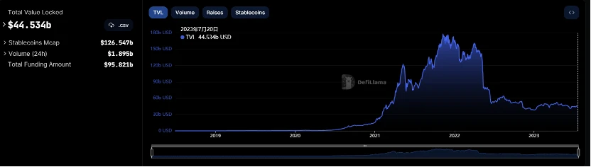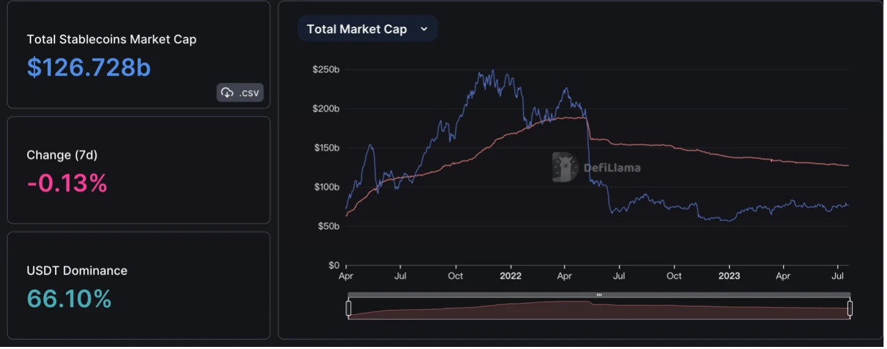 场内稳定币市值略有下降。过去一周,四大稳定币的市值降低 1.2 亿美元,而上周的总市值也降低约 7000 万,代表美元投资者仍然在离场。流动性制约市场购买力,从 2023 年 Q 2 可以明显看到,成交量的高峰出现了下滑。