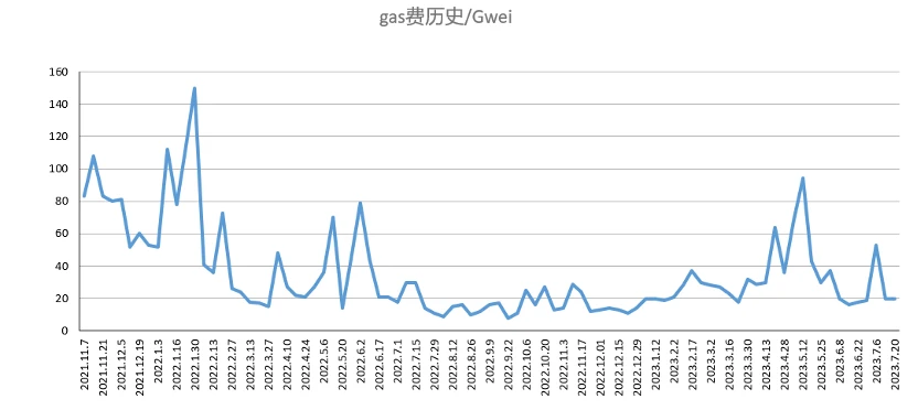 当前链上转账费用约为$ 4.36 , Uniswap 交易费用约为$ 14.85 ,Opensea 的交易费用约为$ 5.77 。对比上周 Gas 情况,本周 Gas 水平基本与上周持平,但 Uniswap 的交易费用出现了大幅度下降,可能表明交易活跃度出现较大下降,行情相对趋于稳定。