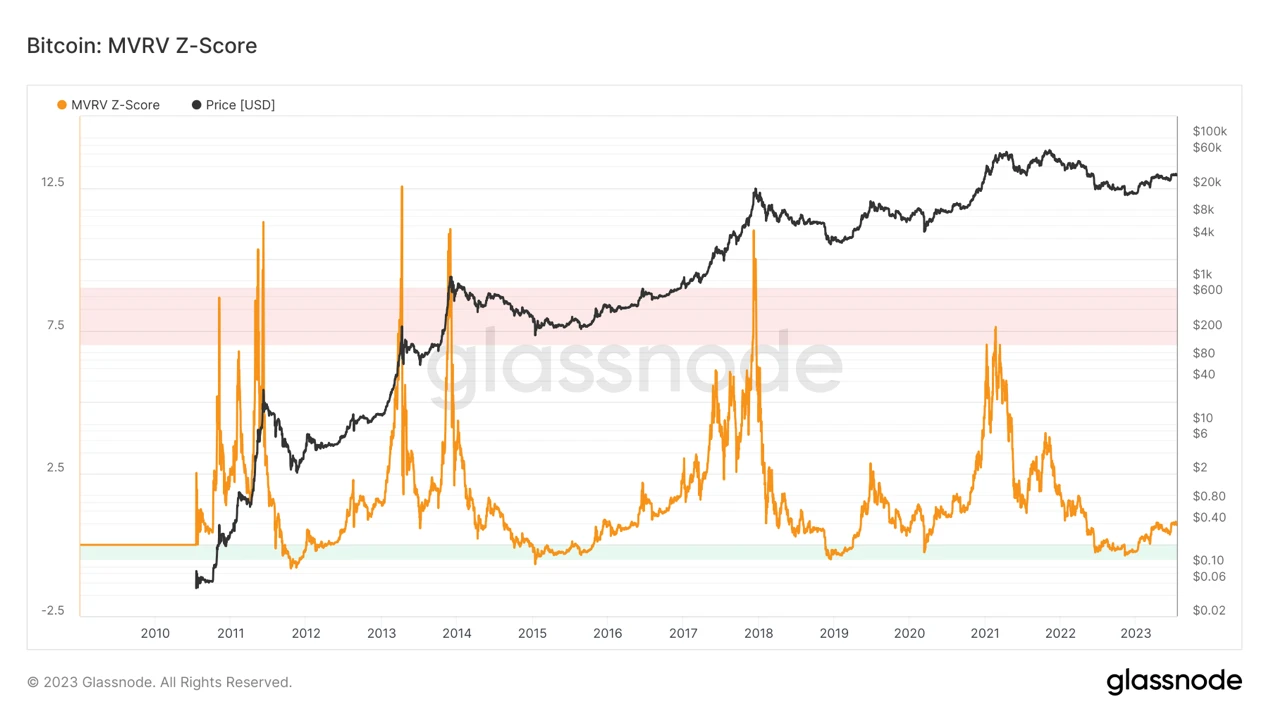 长期趋势指标 MVRV-ZScore 以市场总成本作为依据,反映市场总体盈利状态。当指标大于 6 时,是顶部区间;当指标小于 2 时,是底部区间。MVRV 跌破关键水平 1 ,持有者总体上处于亏损状态。当前指标为 0.69 ,进入复苏阶段。