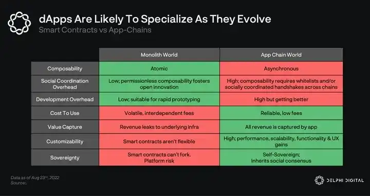 应用链是 Cosmos 创新生态不可或缺的组成部分,代表着满足不同用例的专业化和特定应用区块链。与传统的单片区块链不同的是,通过 Cosmos SDK 采用模块化方法,使开发人员能够根据其 dApps 的特定要求定制共识、存储和网络机制。这赋予了应用链一定程度的自主权,让开发者能够更好地控制自己的应用,增强他们塑造用户体验的能力。此外,Cosmos 应用链模式提供了诱人的收益机会,允许 dApp 创作者探索独特的货币化策略,并促进各自链内的可持续增长。