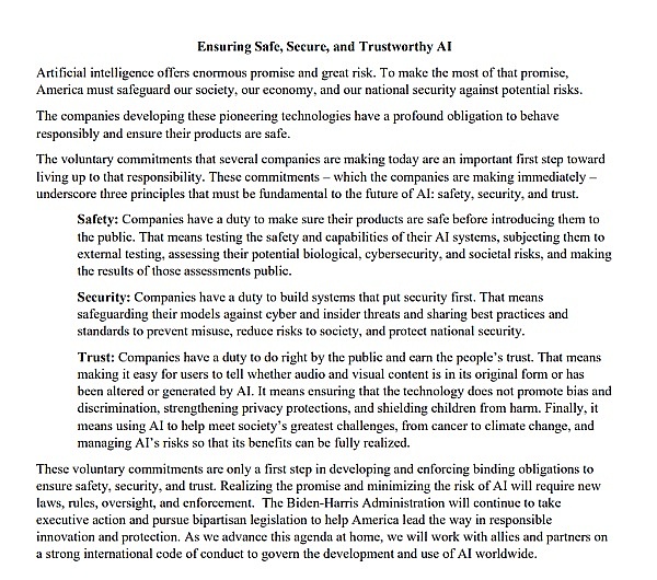 当地时间7月21日,包括亚马逊、谷歌、Meta、微软与OpenAI等七家顶级人工智能科技公司的高管在白宫召开会议。这些企业高管表示: 自愿承诺AI监管八项措施 。