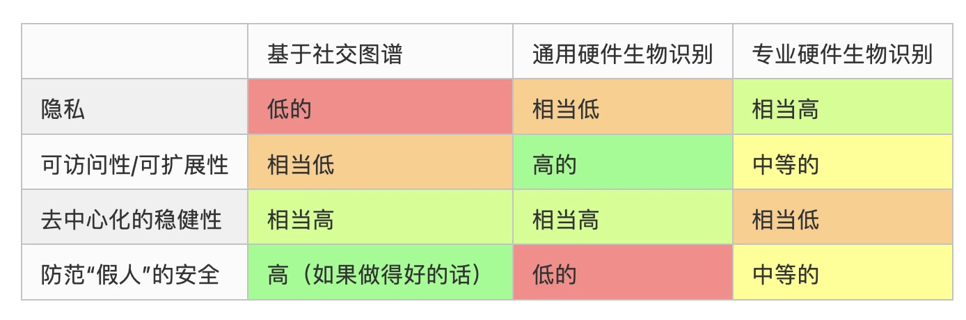 隐私:虽然基于社交图谱的方法可以避免收集生物识别数据,但最终往往会泄露一个人的社交关系信息,这可能会导致更大的风险。当然,零知识技术可以缓解这一问题(例如,请参阅 Barry Whitehat 提出的建议),但图中固有的相互依赖关系以及对图进行数学分析的需要,使其难以达到与生物识别技术相同的数据隐藏水平。